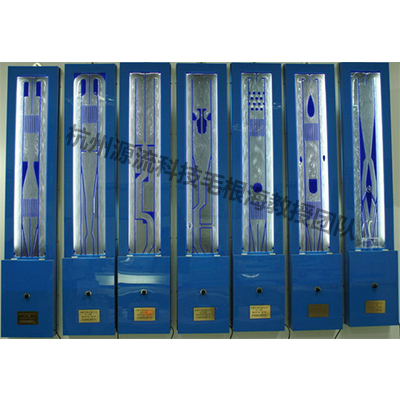 以自循環多流道組成顯示屏,以氣泡為示蹤介質,利用光折射技術,演示30余種流譜圖案及相關原理。如:演示內流場的漩渦形成、邊界層分離、介質傳輸、水塞等流道流譜;演示外流的尾跡形成、卡門渦街、傳質傳熱等流場流譜;演示射流元件、附壁效應與射流控制原理等流型流譜。